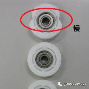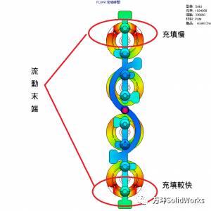 ● 充填短射图-从模拟与实际的射出短射产品可看出,此产品的流道设计为不平衡的,在短射图中可看出上下两个辊轮为流动的末端,但如果此产品为对称的应该会是同时充填完成,从结果中发现上方比下方流动的慢,其主要的原因为受到重力场的影响,再者此副模具因为修模多次,造成模具品质下降,因此人为因素也有影响产品的流动状况(图6)。