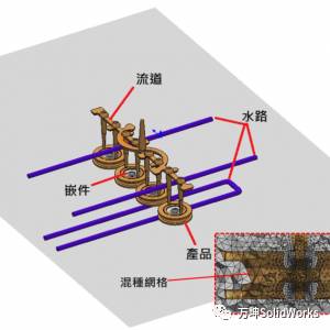 本案例透过SOLIDWORKS处理模型配置,并且使用SOLIDWORKS Plastics进行网格划分,网格类型为四面体混种网格,水路使用同轴网格,模具则使用四面体网格建立,网格总数约为159万元素(图3)。