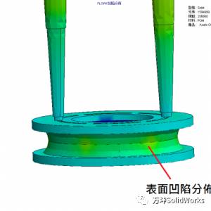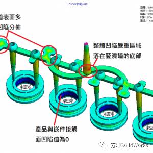 ● 凹陷结果-从SOLIDWORKS Plastics的凹陷结果看出,整体凹陷最严重的区域为竖浇道的底部,此处也是整体肉厚最厚的区域,在流道的表面也可看出浅绿色的凹陷分布,而产品与嵌件接触面凹陷值为0mm,主要的原因是金属能够帮助热的降温,所以此处受到有效的降温并且表面产生足够抵抗收缩的劲度,不过之前提到虽然表面不再产生凹陷了,但内部却有可能产生空孔现象,目前的软体包括其他同业软体都还不能够呈现内部空孔的结果显示,因此可以从体积收缩率的结果预测空孔的产生(图7)。