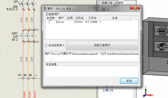 用户间可以实时聊天交流,讨论设计修改与确认,整个过程不需要离开SOLIDWORKS Electrical 2D / SOLIDWORKS Electrical 3D环境,通过聊天工具直接进行交流,确保设计的同步和减少设计错误发生的概率。